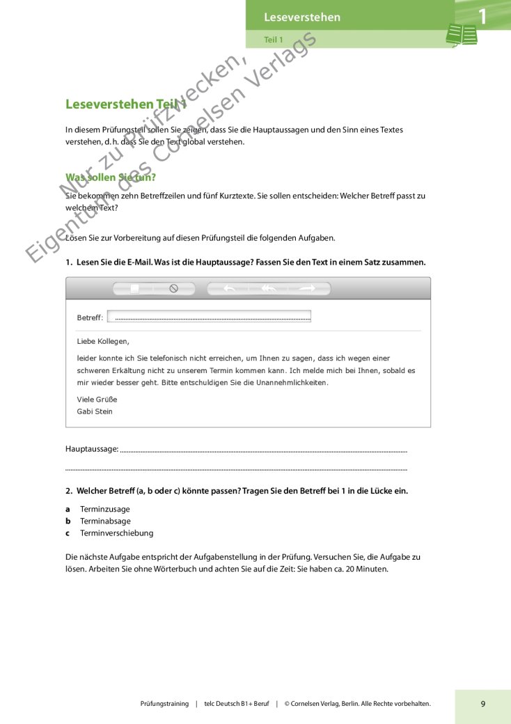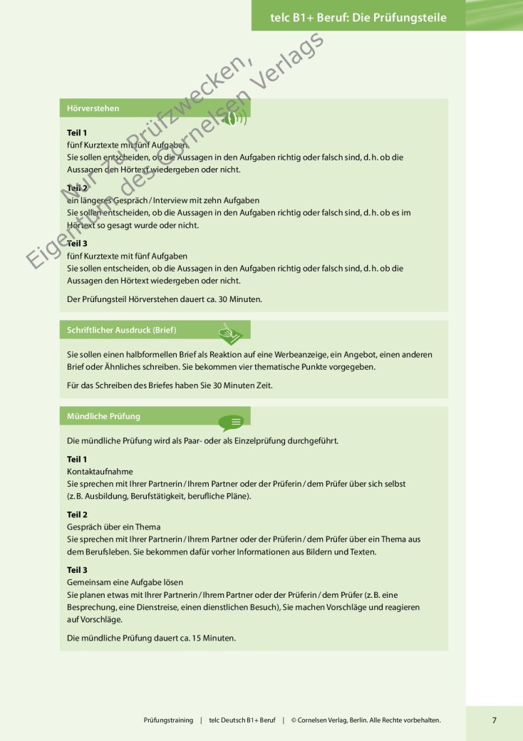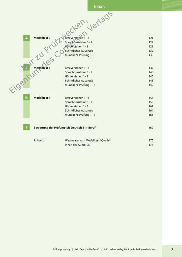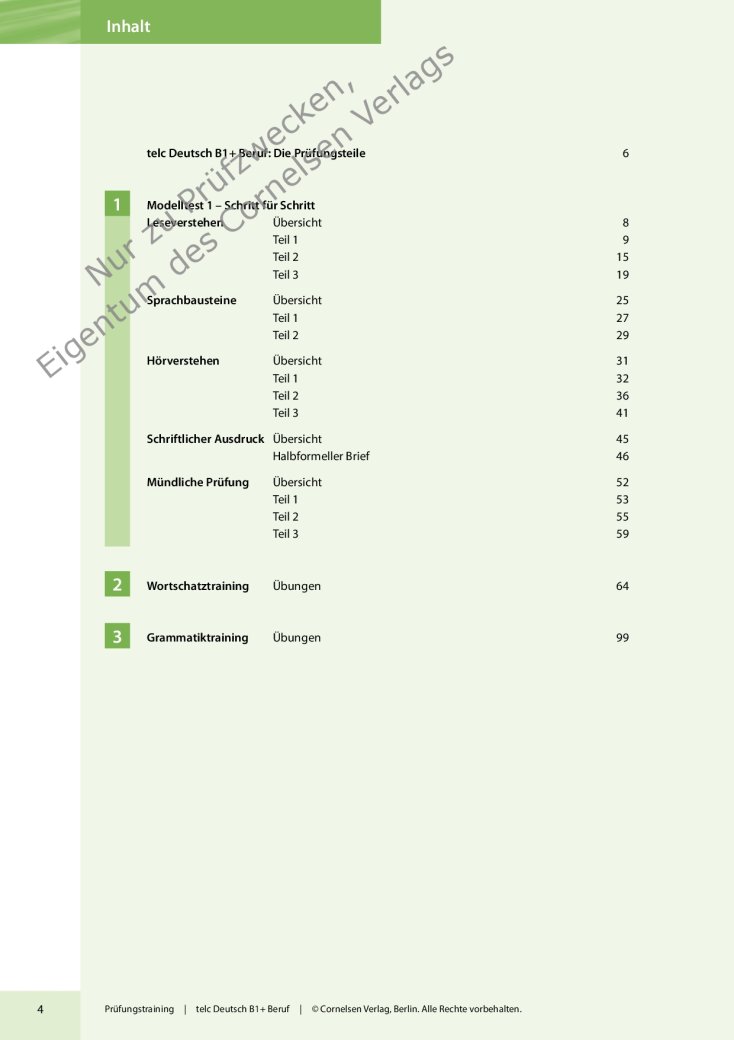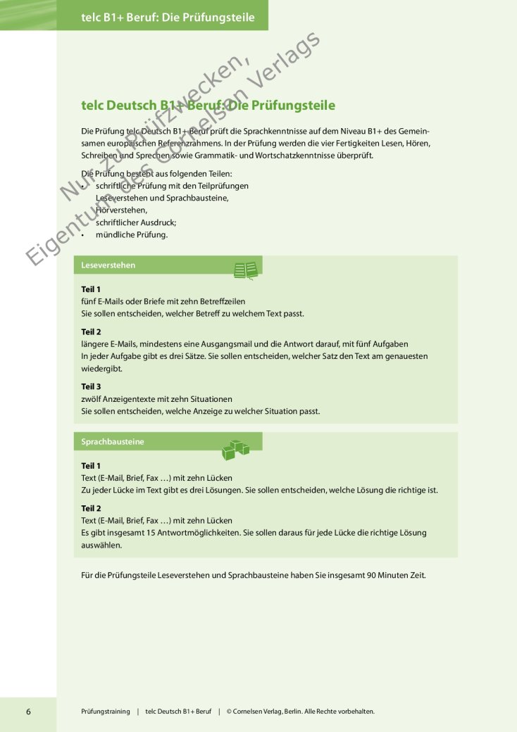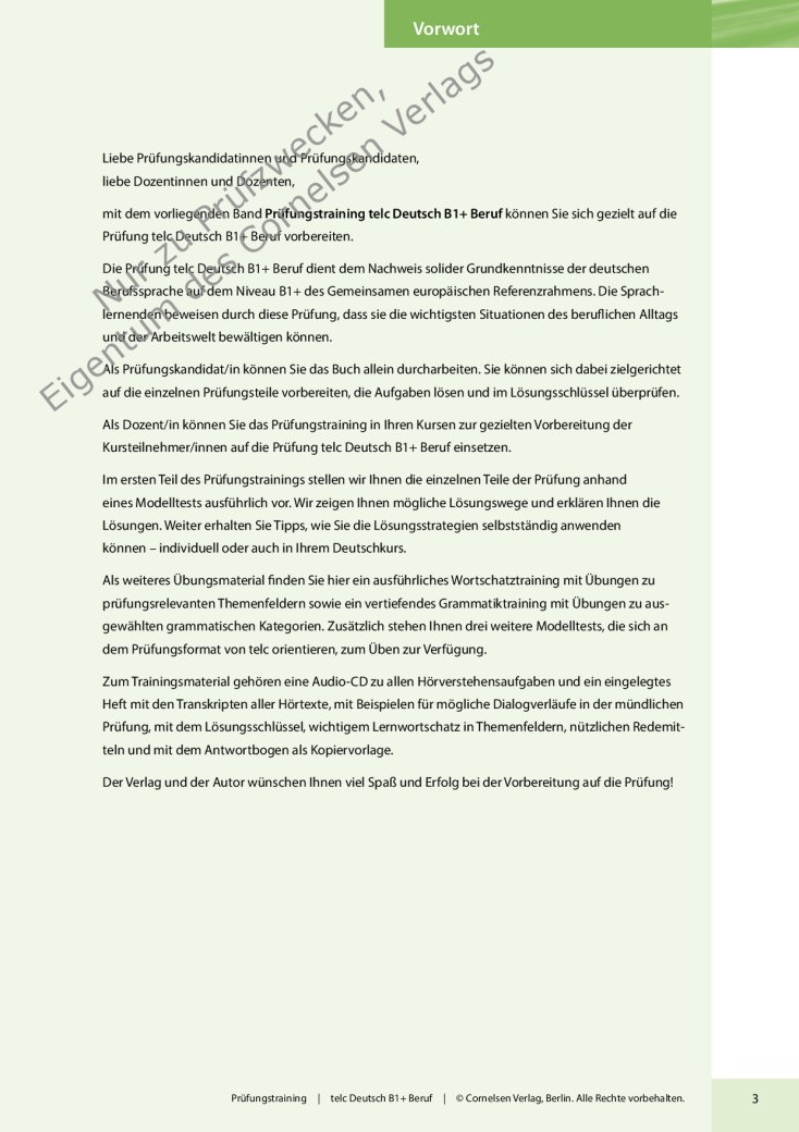 - Übungsmaterial zu den prüfungsrelevanten Wortschatzthemen sowie ein vertiefendes Grammatiktraining bereiten optimal auf die Prüfung telc Deutsch B1+ Beruf vor.